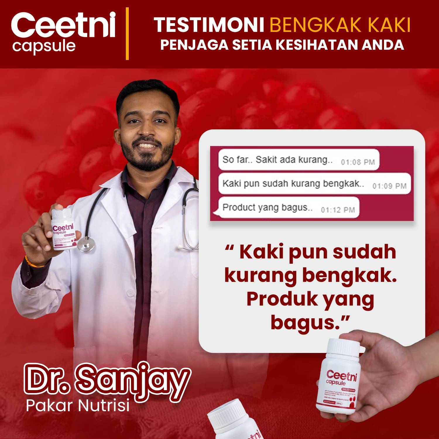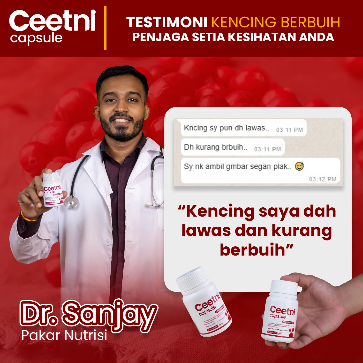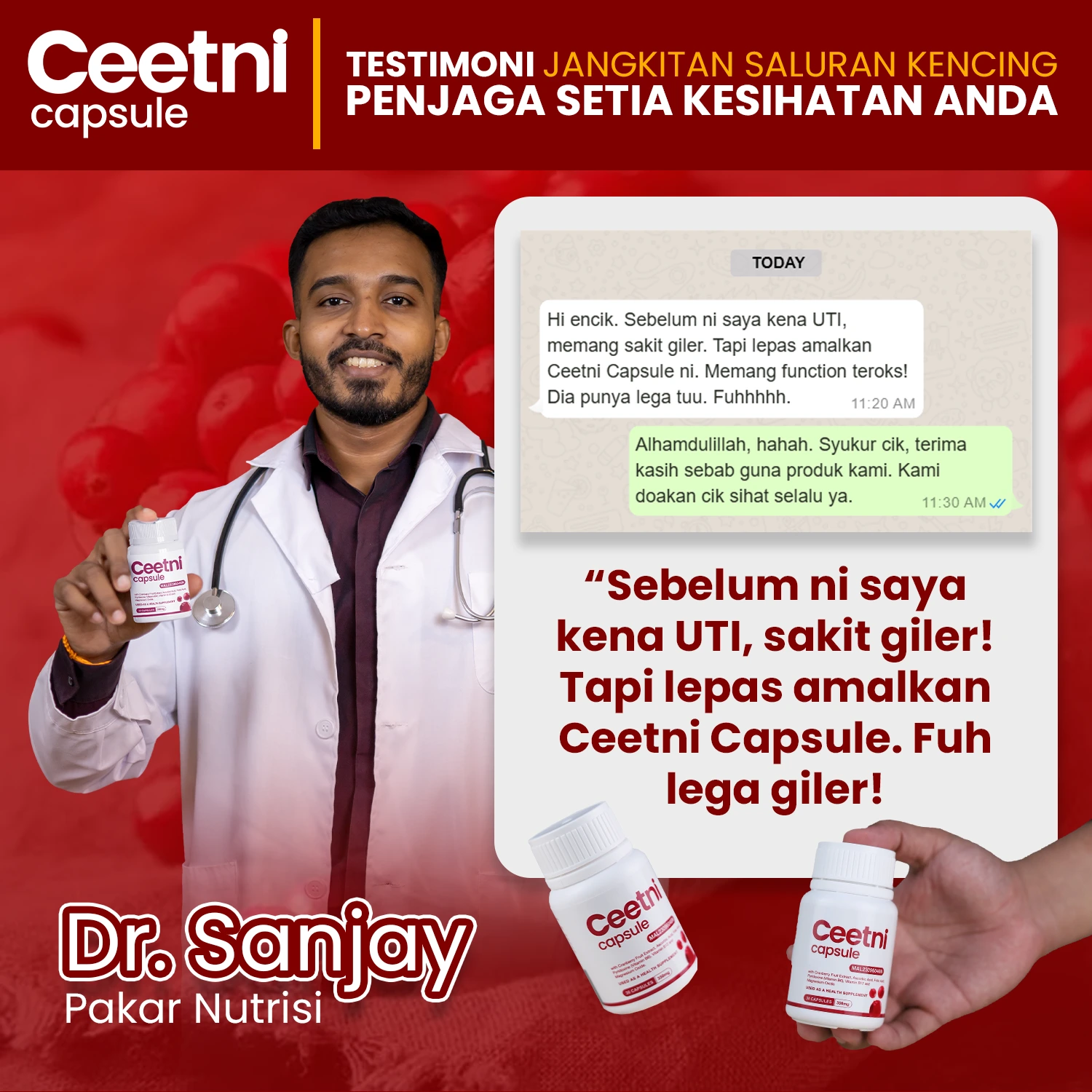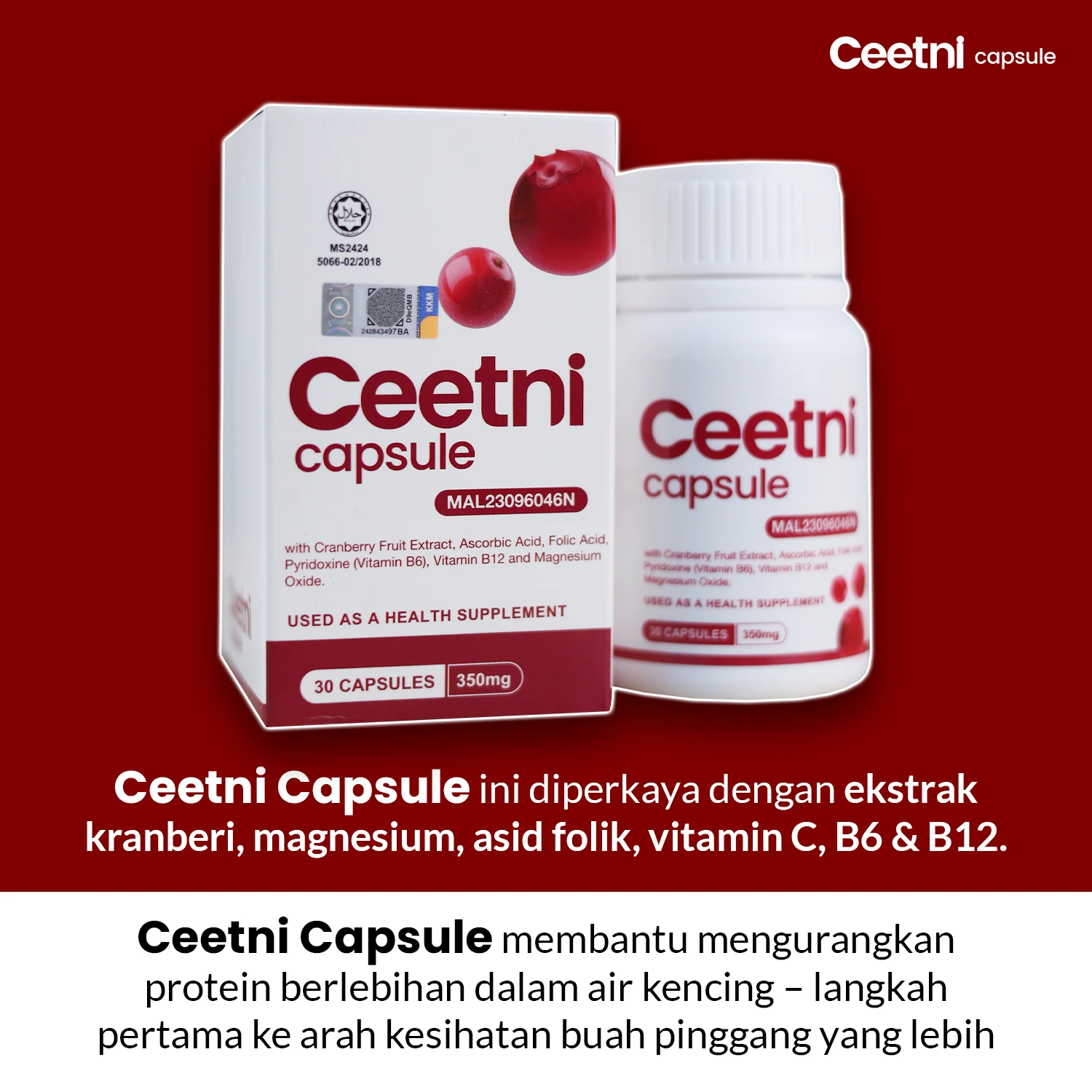 Ceetni Capsule adalah suplemen kesihatan yang mengandungi ekstrak buah kranberi, vitamin c, asid folik, magnesium oksida, vitamin B, vitamin B6 dan vitamin B12. Ia digunakan untuk menjaga dan menstabilkan serta meningkatkan kesihatan buah pinggang, mencegah jangkitan saluran kencing (UTI), dan mencegah kerosakan buah pinggang terumata pesakit diabetes.