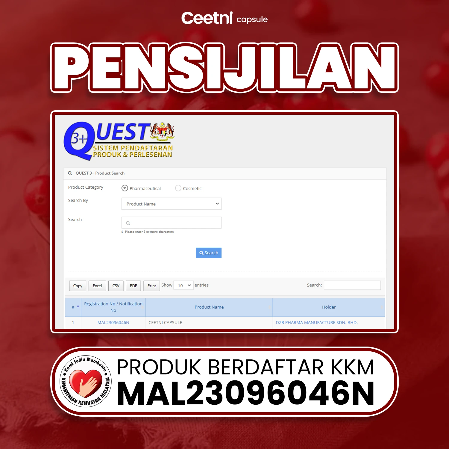 Ya, Semestinya untuk jaminan dos yang disarankan dan selamat diamalkan ceetni capsule telah mendapat kelulusan dari pihak KKM. Anda juga boleh check diwebsite rasmi KKM untuk pengesahan.