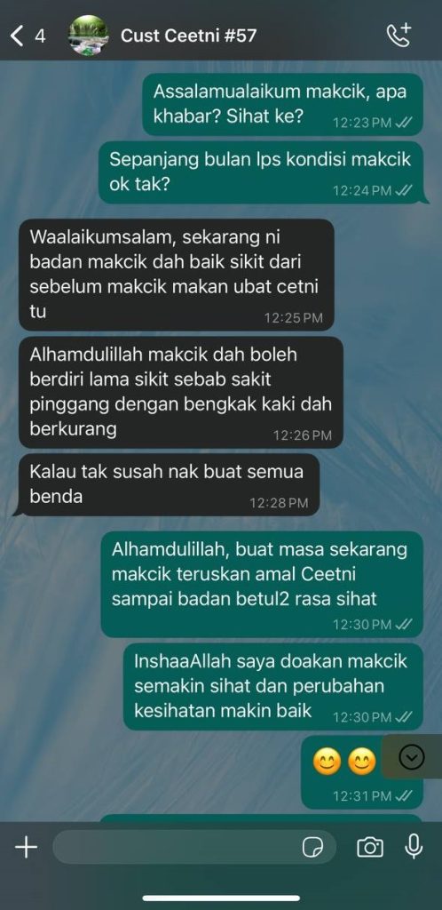 Jika ada sakit kronik anda digalakkan untuk dapatkan nasihat dari doktor perubatan yang sah jika ingin mengambil ceetni capsule. Ceetni capsule adalah makanan tambahan dan bukan ubat yang confirm akan sembuhkan anda dalam masa yang singkat. Selainnya tawakkal dan berserah pada ALLAH S.W.T